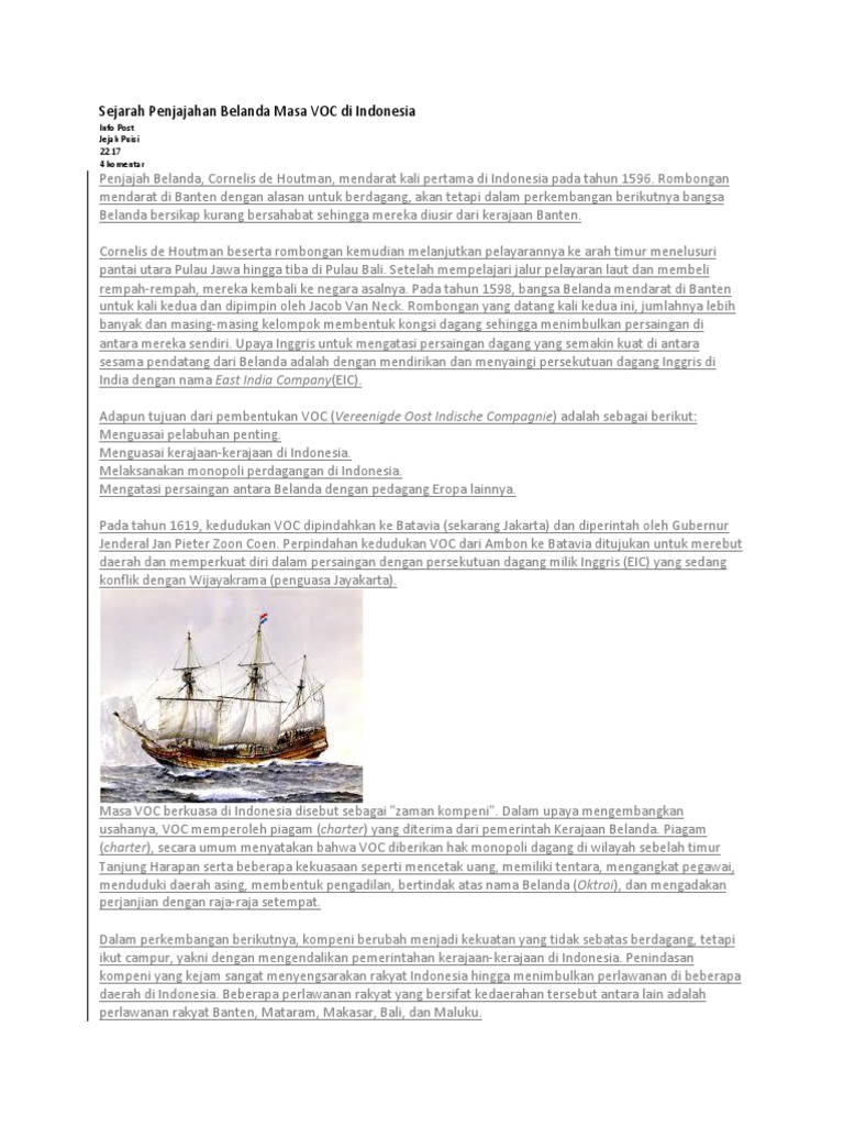 Berikut sejarah singkat kelahiran voc seperti dikutip dari a history of modern indonesia since c. Untuk mendapatkan akses ke asia timur, yang pada awalnya diupayakan pada jalur darat yang sangat berbahaya. Pada 1669, voc merupakan perusahaan pribadi terkaya dalam sepanjang sejarah, dengan lebih dari 150 perahu dagang, 40 kapal perang, 50.000 pekerja, angkatan bersenjata pribadi dengan 10.000 tentara, dan pembayaran dividen 40%. Vereenidge oostindische compagnie, atau apa yang sering dikatakan voc, adalah aliansi perusahaan india timur. Sejak tanggal 31 desember 1799, voc resmi dibubarkan.